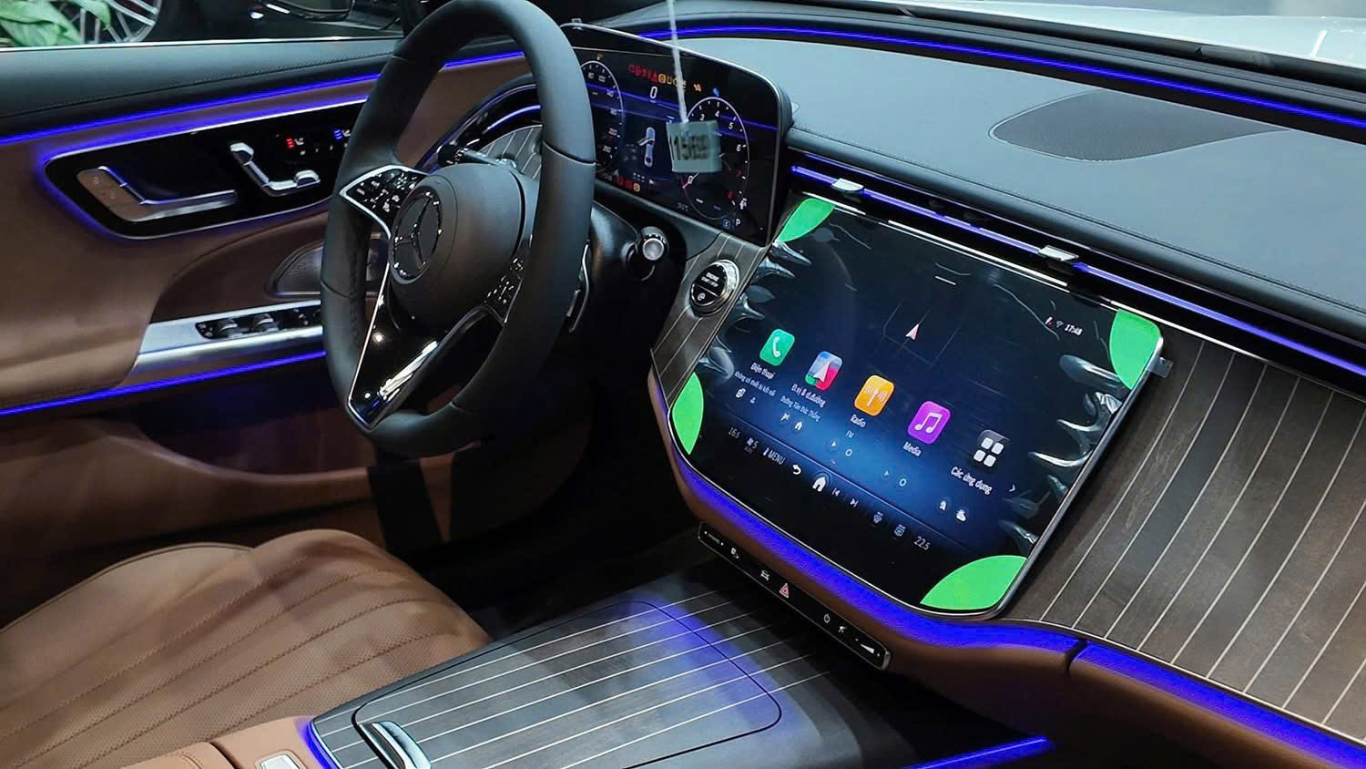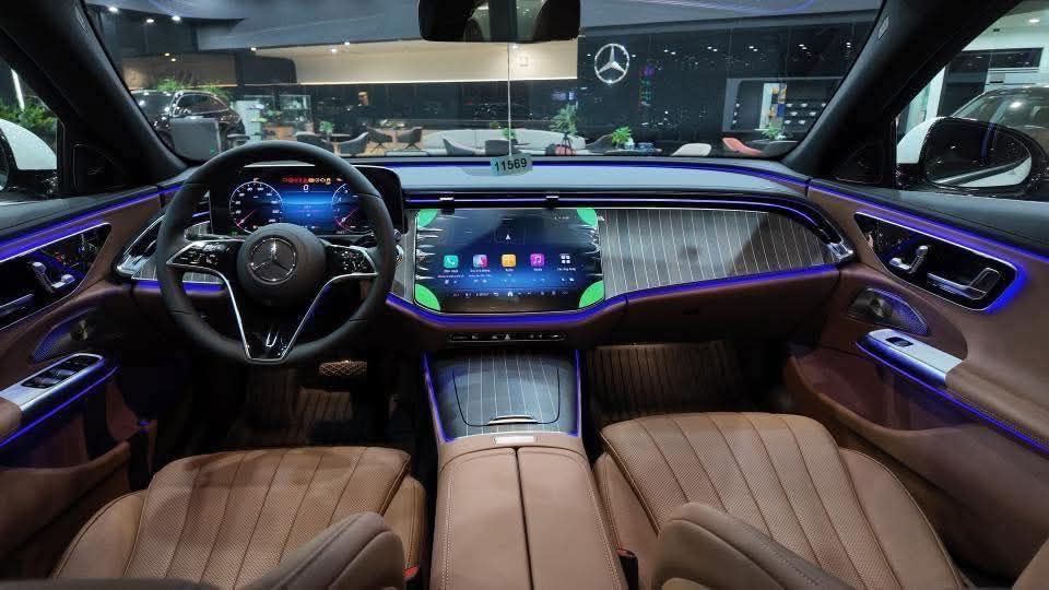 Bên trong E 200 Exclusive 2025 được ốp gỗ phong màu nâu sang trọng và hiện đại. Điểm chú ý khác trong nội thất của biến thể mới này là màn hình thông tin giải trí 12,3 inch trang bị hệ điều hành giải trí MBUX mới nhất sẽ cho phép khách hàng điều khiển xe qua màn hình cảm ứng, giọng nói, nút cảm ứng ở trên tay lái.